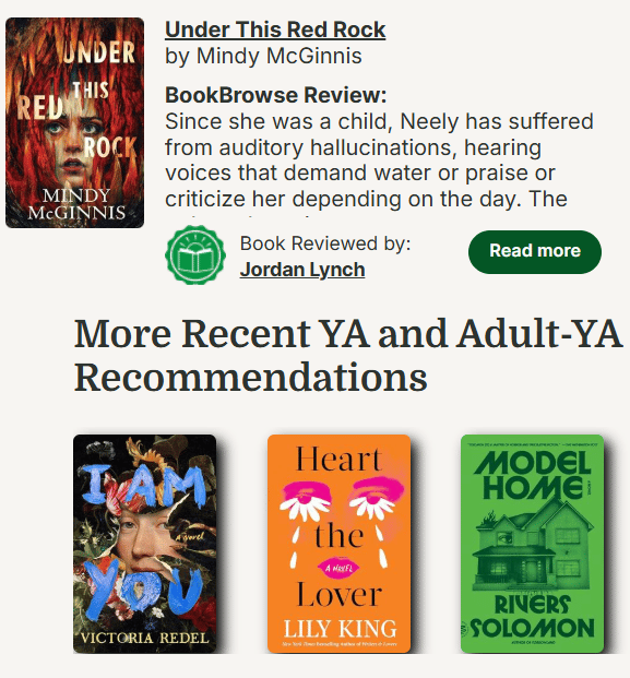 YA on BookBrowseDid you know that BookBrowse offers a page with YA-specific rotating features? Check out recent recommended YA and YA-Crossover books with read-alikes, YA reading lists, YA books publishing soon, and more. You and your patrons can also browse books in our YA category. Subscribing libraries get access to all young adult content, while others have limited access. |