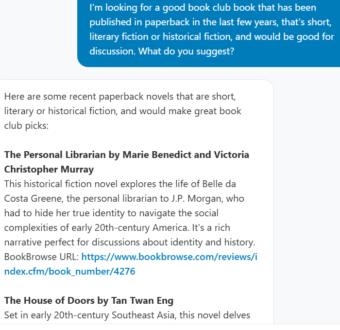 We’re also excited to bring you some new site features, including our AI BookBrowse Assistant, which you and your patrons can chat with to get customized recommendations.